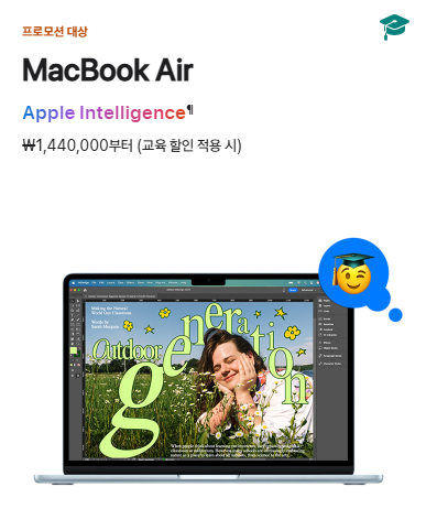 - 할인 적용 제품 : MacBook Air, MacBook Pro, iMac, Mac mini, iPad 시리즈